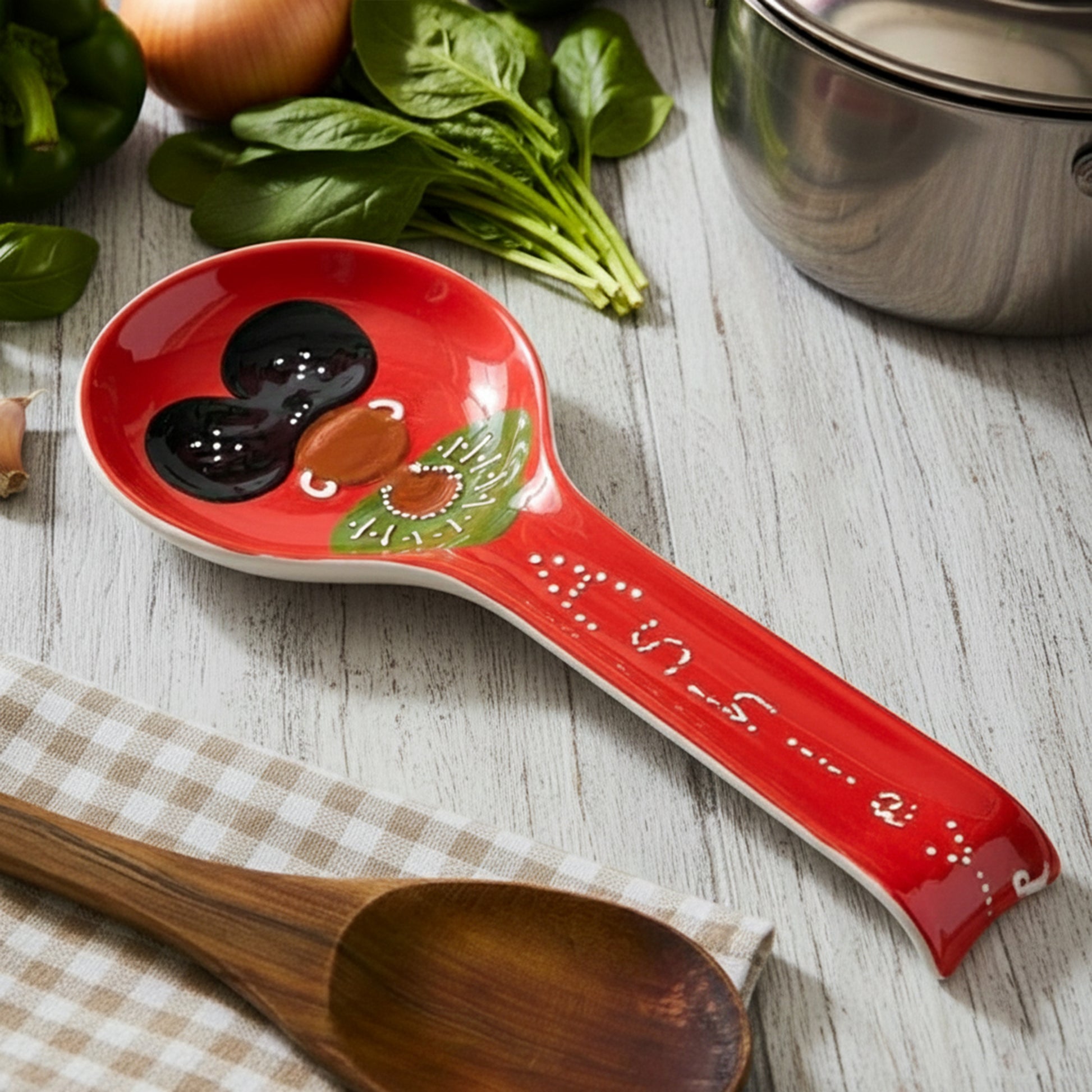 Add charm, color, and personality to your kitchen with this adorable, one-of-a-kind, hand-glazed ceramic spoon holder. Every piece is uniquely designed—no two are alike—making it a delightful and functional work of art for your home.